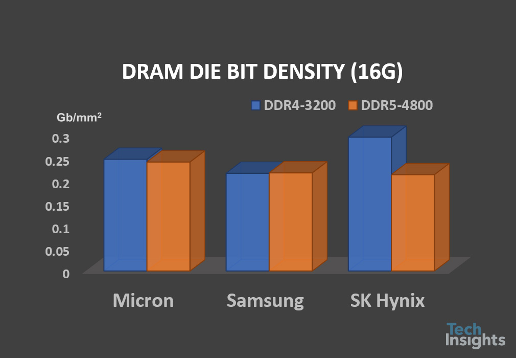 第一个是TeamGroup ELITE DDR5 UDIMM,具有16 GB DDR5器件,其中DDR5 MT60B2G8HB-48B:A芯片由美光(Y32A芯片)制造。我们分析的第二款是G.SKILL Trident Z5 DDR5内存F5-5600U3636C16GX2-TZ5K与三星DDR5 K4RAH086VB-BCQK器件(K4RAH046VB模具)。第三个来自SK海力士,32 GB HMCG88MEBUA81N DDR5 UDIMM PC5-4800B模块(H5CNAG8NM模具)。模具图像添加到表格中以供参考。美光应用了M-D1z工艺技术节点,三星和SK海力士则采用了D1y工艺(S-D1y和H-D1y)。正因如此,DDR5的模具尺寸从美光(66.26毫米)开始2比三星(73.58毫米)小2)和SK海力士(75.21毫米)2).