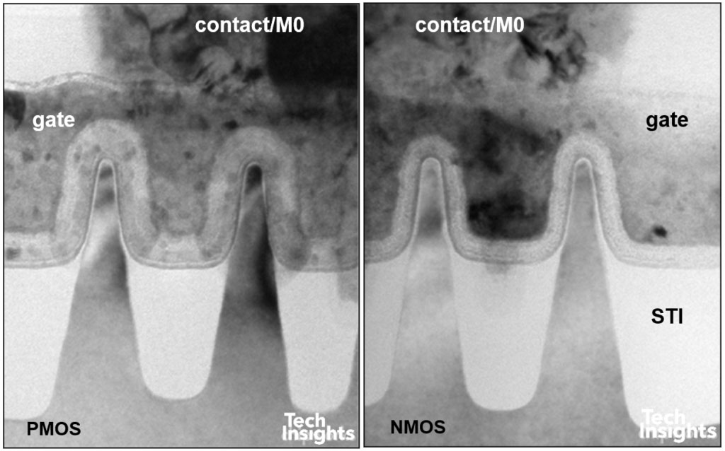 额外的微妙之处在于PMOS堆栈首先在整个晶圆上构建,然后在NMOS区域将其蚀刻回钽层,然后沉积NMOS堆栈。我们还可以看到,PMOS源/漏中嵌入的SiGe采用(111)平面来改善应力向通道的传递。在这些图像中看不到从通过小孔接触到沟渠接触的变化。
